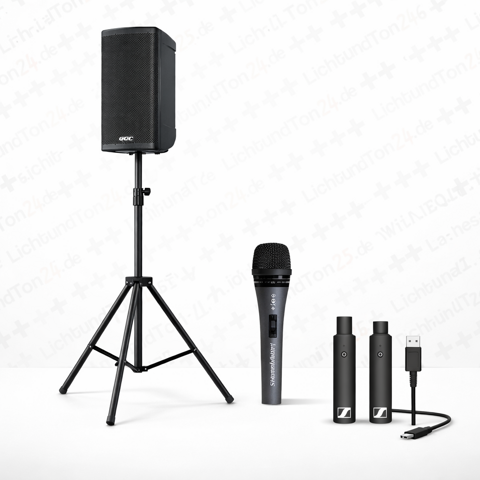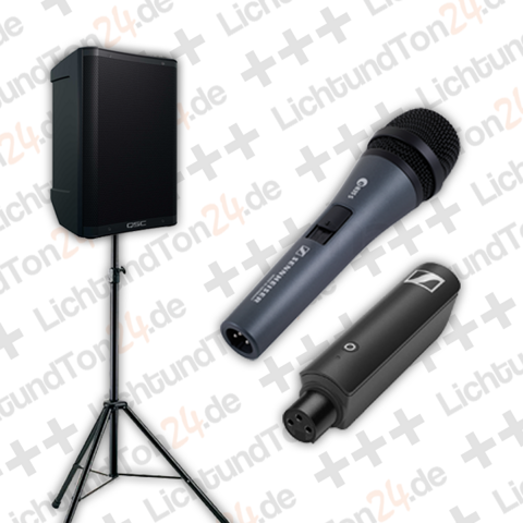 Der hochwertige QSC CB10 Akku-Lautsprecher sorgt für klaren, durchsetzungsstarken Sound, während das Sennheiser Funkmodul ein gewöhnliches Kabelmikrofon funkfähig macht.