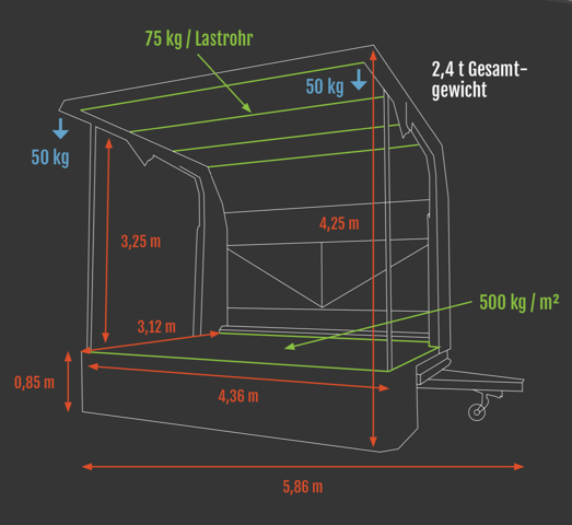 Maße: 4,36m breit  x 3,12m tief Länge inkl. Deichsel 5,86m