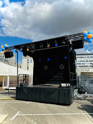 Diese mobile Bühne ist praktisch und kompakt zu gleich. Durch den geringen Aufbauaufwand kann eine kostengünstige  Überdachung sowie Erhöhung beim nächsten Event realisiert werden.